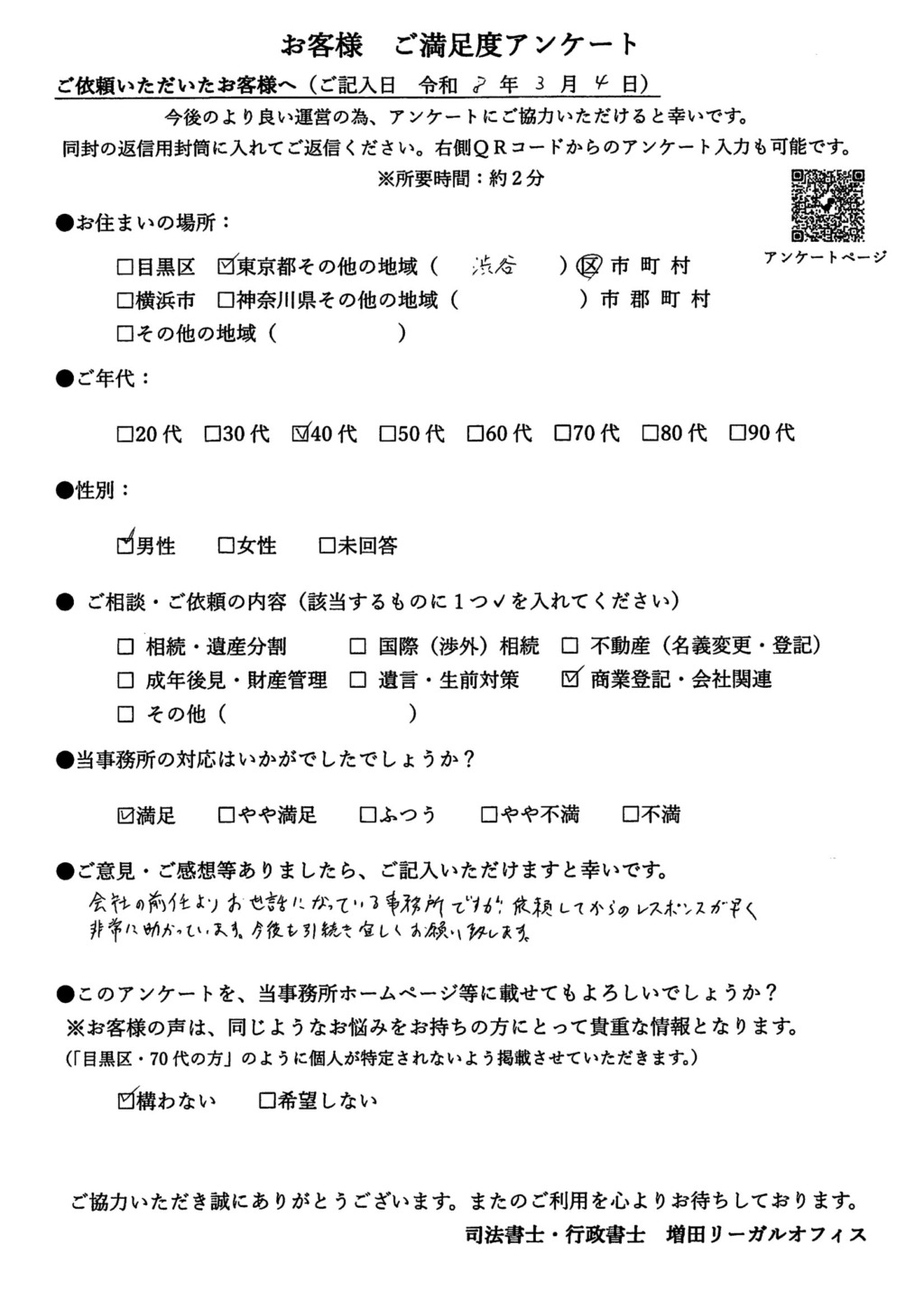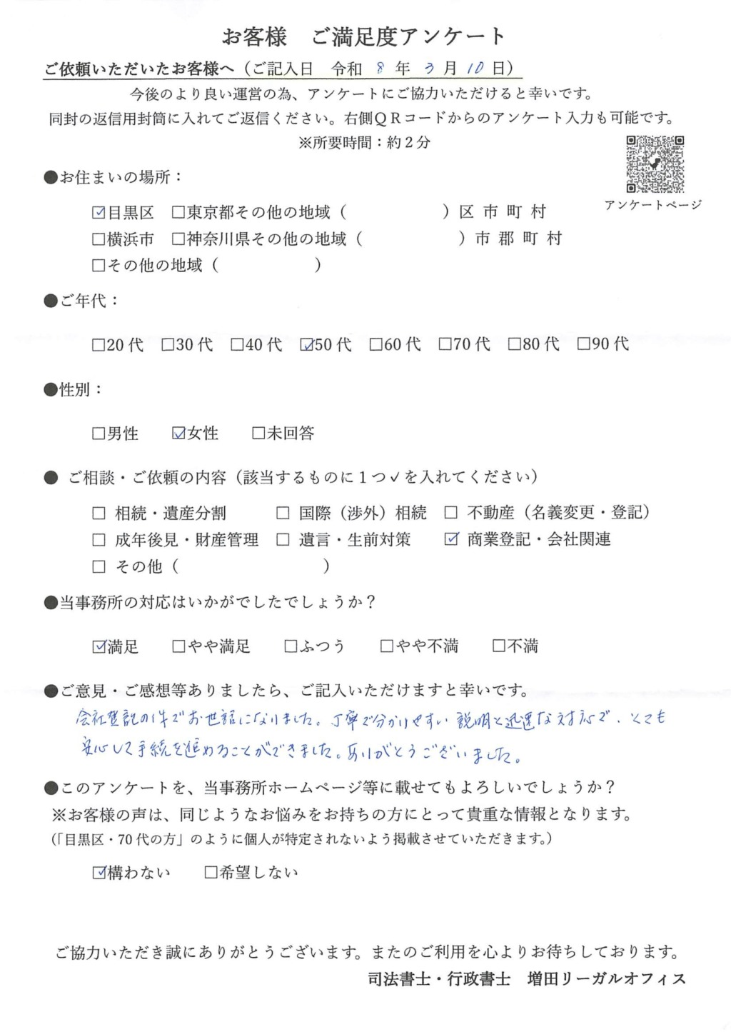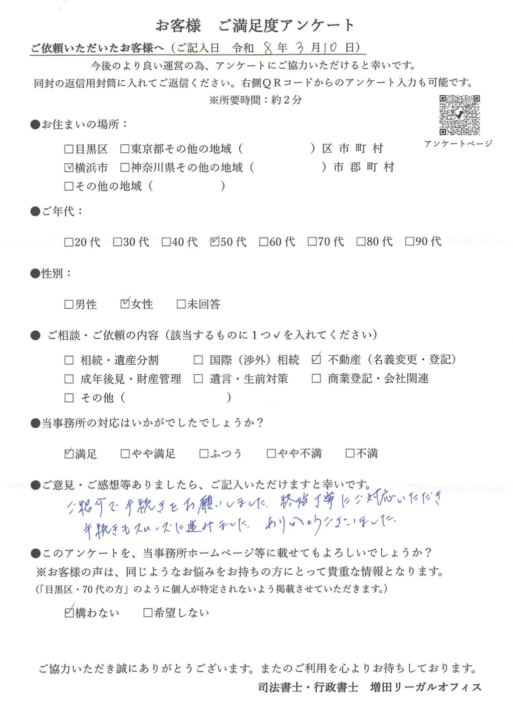 増田リーガルオフィスでは、手続き完了後にお客様アンケートへのご協力をお願いしています。実際にいただいたお声をご紹介するとともに、Googleレビューへのご協力への感謝と、今後の事務所運営への思いについてお伝えします。