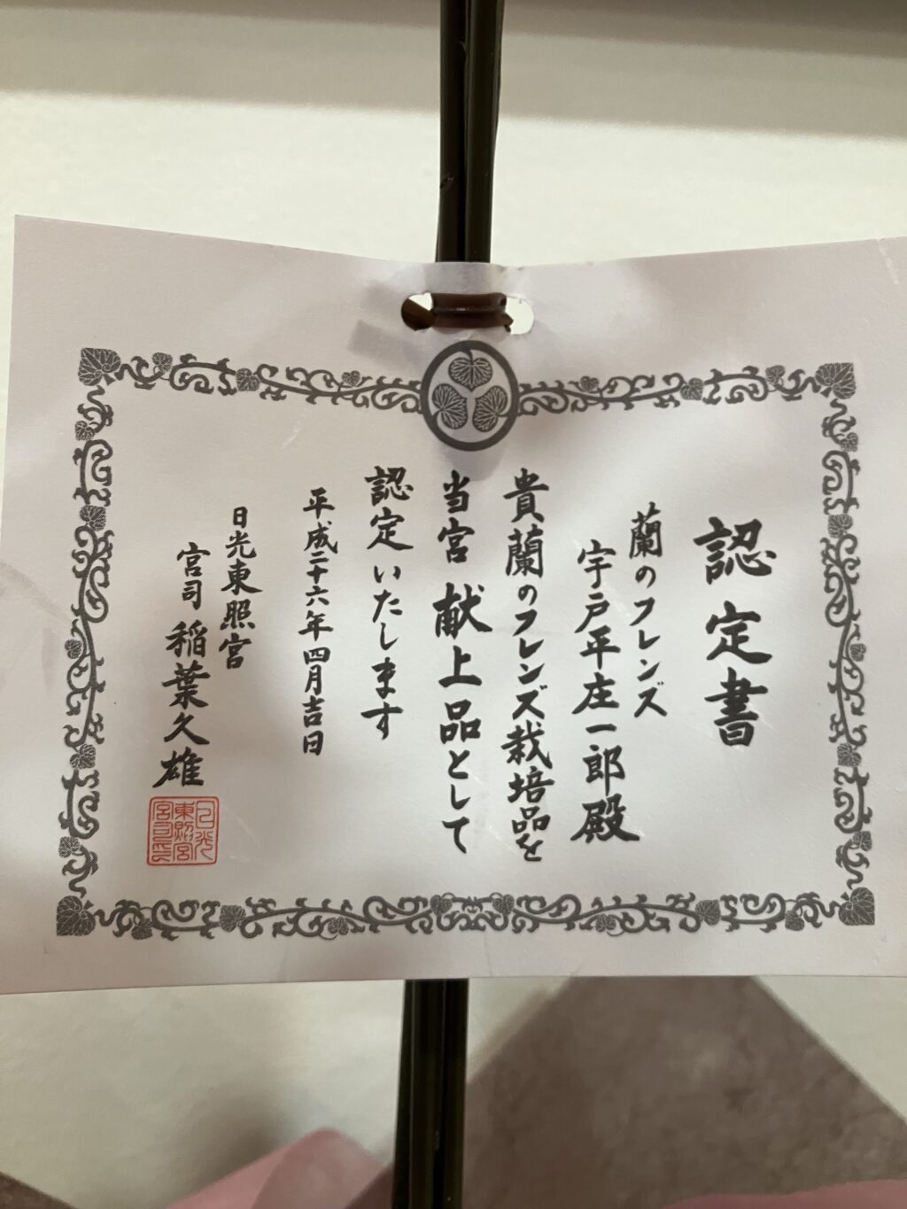 「日光東照宮献上品」に認定された胡蝶蘭、とのことです。