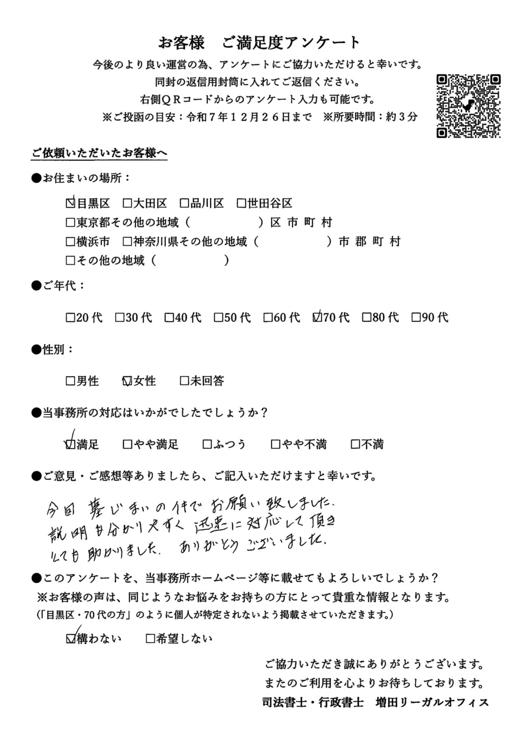 墓じまいの件でお願い致しました。説明も分かりやすく迅速に対応して頂きとても助かりました。